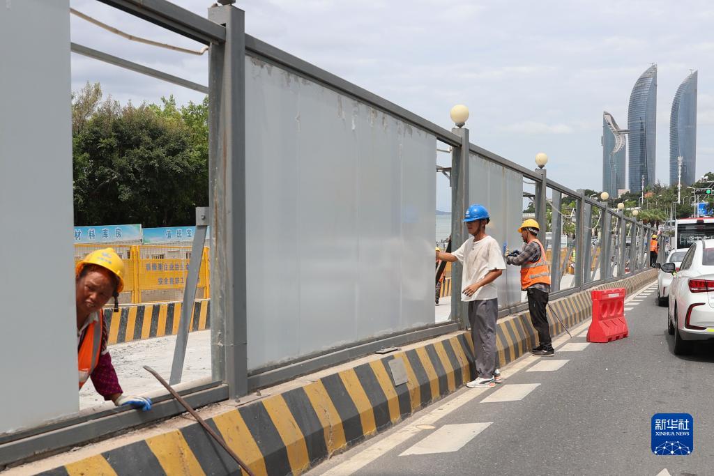7月27日,工人在福建廈門環島路拆除可能受臺風影響的施工工地圍擋。