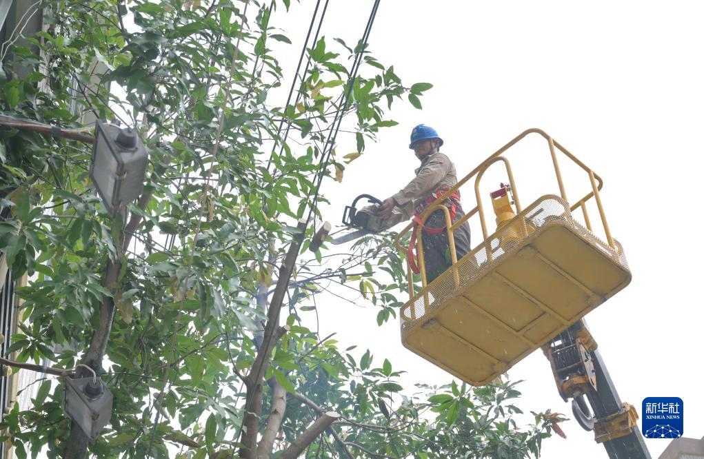 7月27日,國網漳浦縣供電公司員工在漳浦縣青年路修剪樹枝,防止臺風天氣樹枝觸碰電力設施導致線路跳閘。