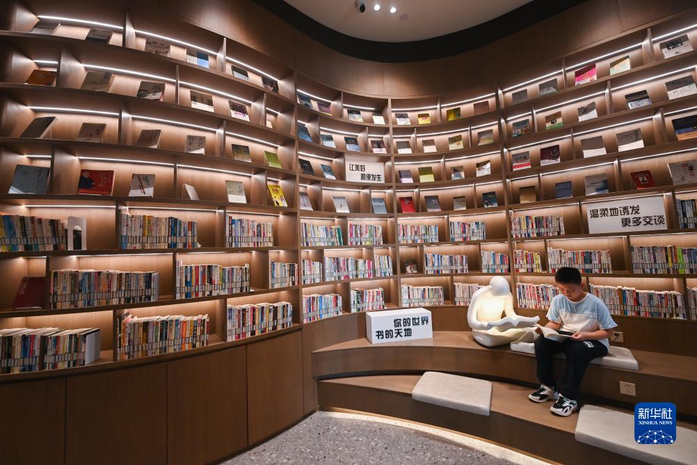 7月27日,兒童在嘉興市南湖區余新鎮漁里未來社區“向日葵親子小屋”的天空書城里看書。