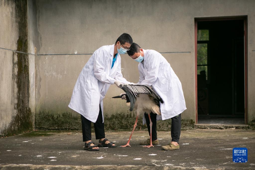 在江西省野生動物救護中心,工作人員在檢查東方白鸛的翅膀受傷情況(7月16日攝)。