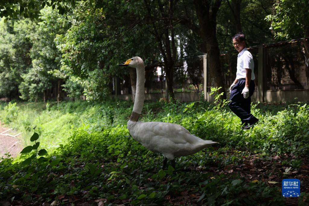 在位于江西省永修縣的江西鄱陽湖國家級自然保護區吳城保護站,王小龍在觀察一只收治的天鵝(7月15日攝)。