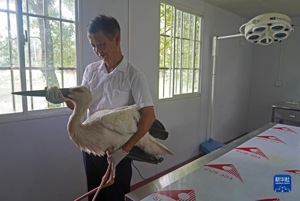 在位于江西省永修縣的江西鄱陽湖國家級自然保護區吳城保護站,王小龍將一只東方白鸛抱出體檢室(7月15日攝)。