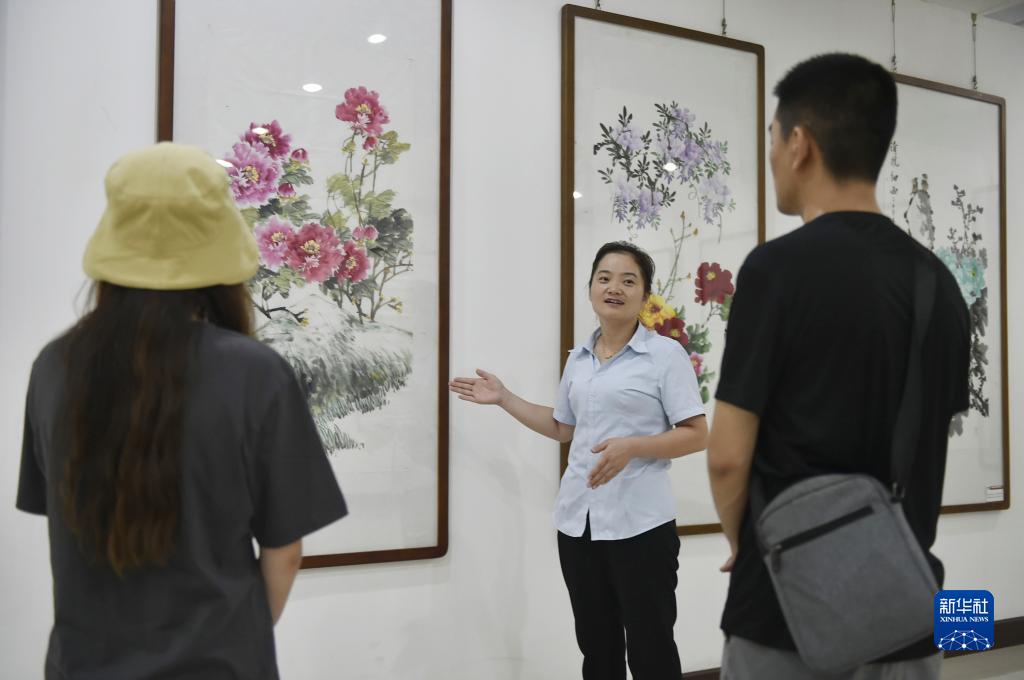 7月26日,工作人員在平樂社區的牡丹畫創意產業園區展廳內向來訪者介紹牡丹畫。