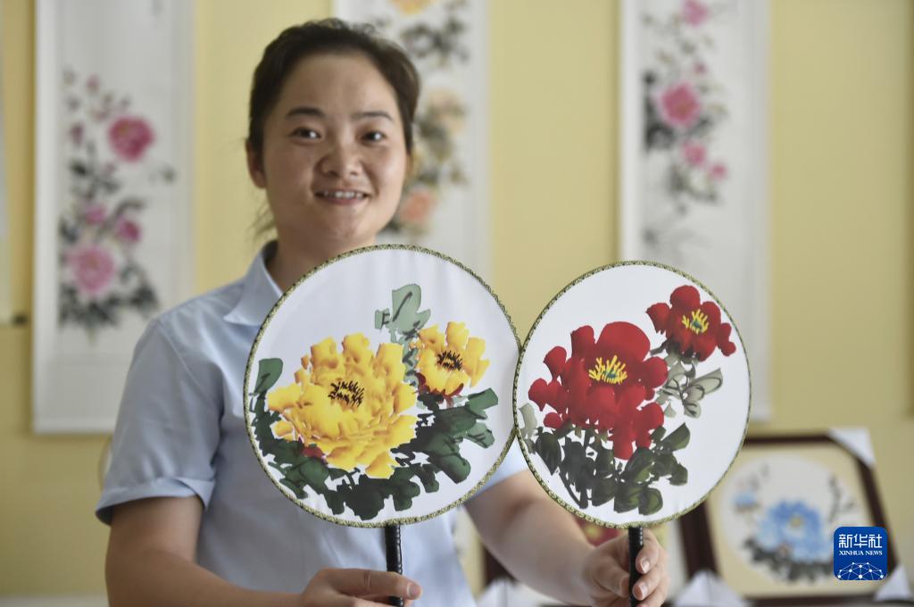 7月26日,工作人員在平樂社區的牡丹畫創意產業園區展廳內展示牡丹畫團扇。