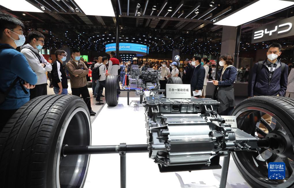 2023年4月24日,參觀者在第二十屆上海車展比亞迪汽車展臺展出的DM-P插混動力單元模型展品前駐足觀看。