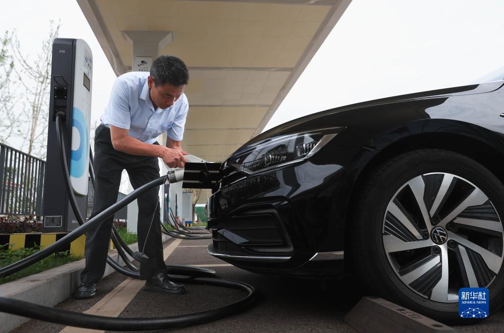 2023年6月29日,一名駕駛員在四川省宜賓市三江新區東部產業園能源港的光伏雨棚下為新能源汽車充電。