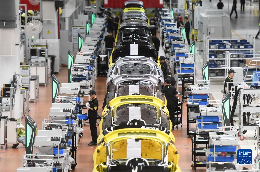2023年6月19日,在位于湖北武漢經濟技術開發區的路特斯全球智能工廠,工人在流水線上生產作業。