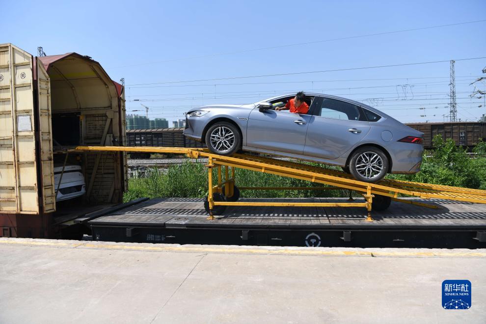 2023年5月9日,在位于合肥市長豐縣的鐵路水家湖貨運站,工作人員裝運新能源汽車。