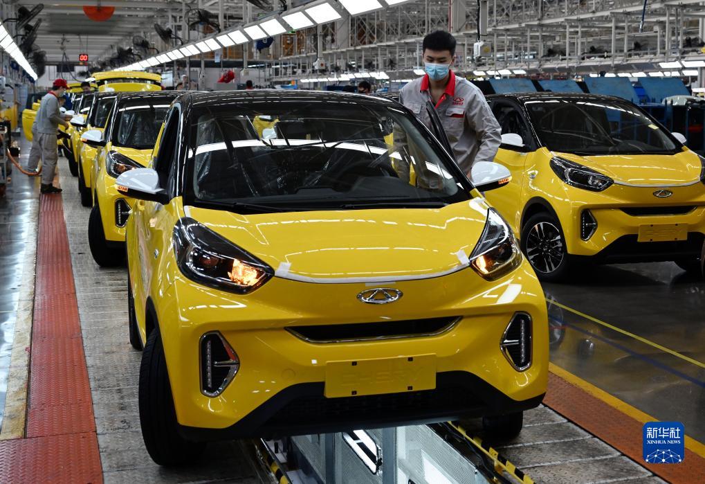 2022年10月12日,在位于安徽蕪湖的奇瑞汽車股份有限公司新能源二期工廠,工作人員在總裝車間忙碌。