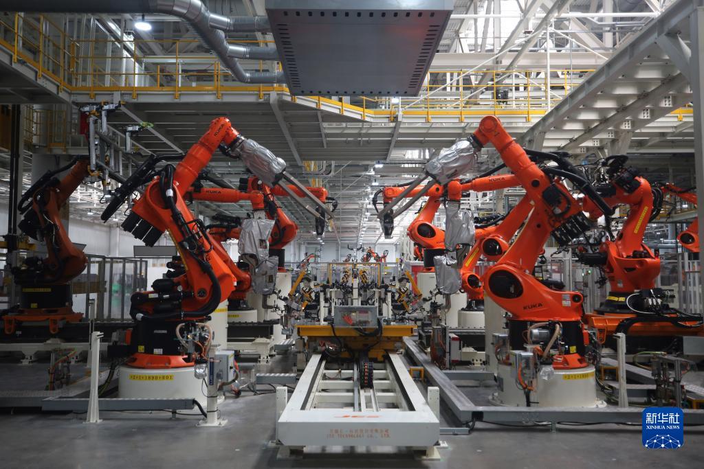 2023年5月29日在安徽合肥拍攝的大眾安徽模塊化電驅動平臺工廠車身車間一角。