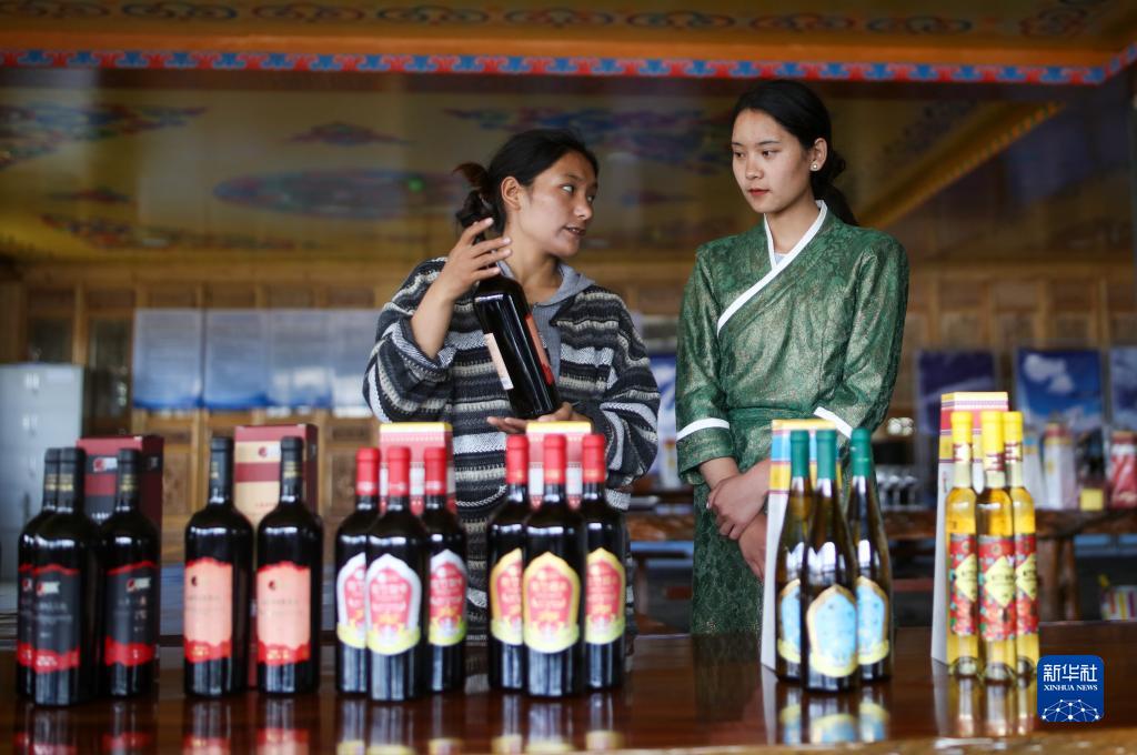 7月26日,桑日縣一家葡萄酒企業的員工曲珍(左)在跟同事一起練習企業葡萄酒產品介紹。