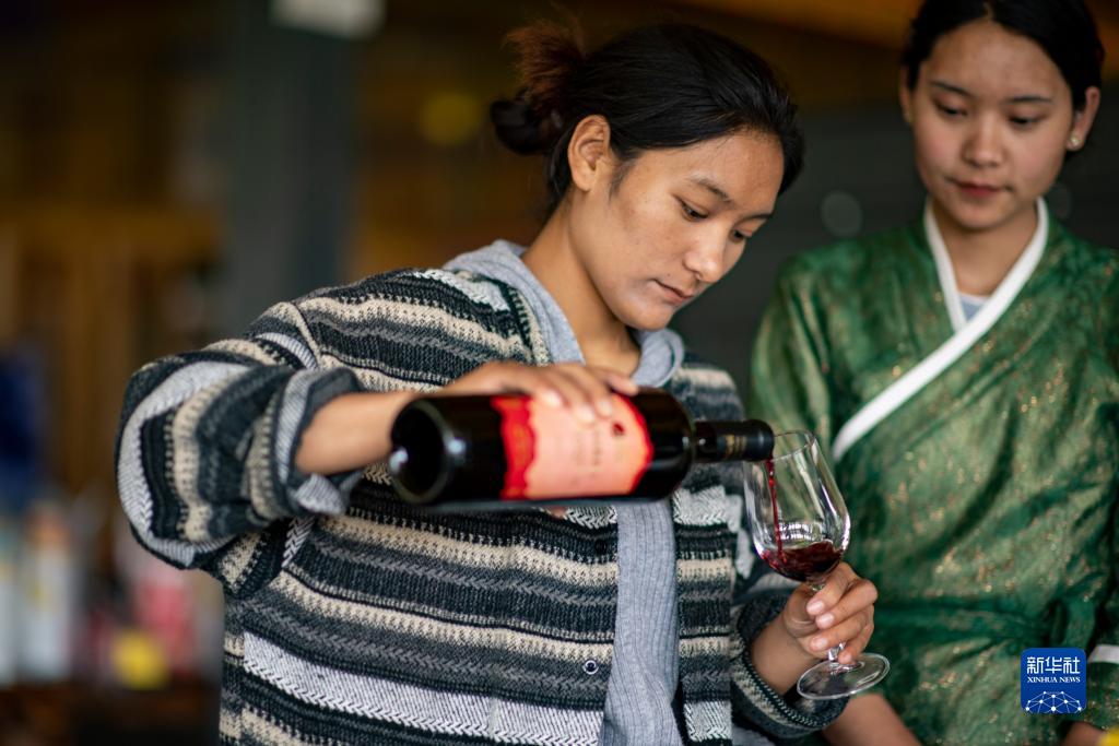 7月26日,桑日縣一家葡萄酒企業的員工曲珍(左)在跟同事一起練習企業葡萄酒產品介紹。