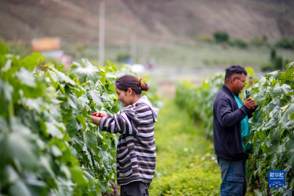 7月26日,桑日縣一家葡萄酒企業的員工曲珍(左)與同事在為葡萄剪枝。
