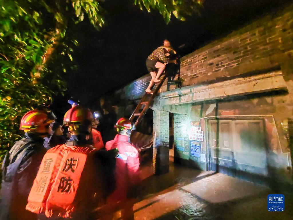 7月28日凌晨,重慶市潼南區五桂鎮,消防救援人員搭梯轉移被困群眾。