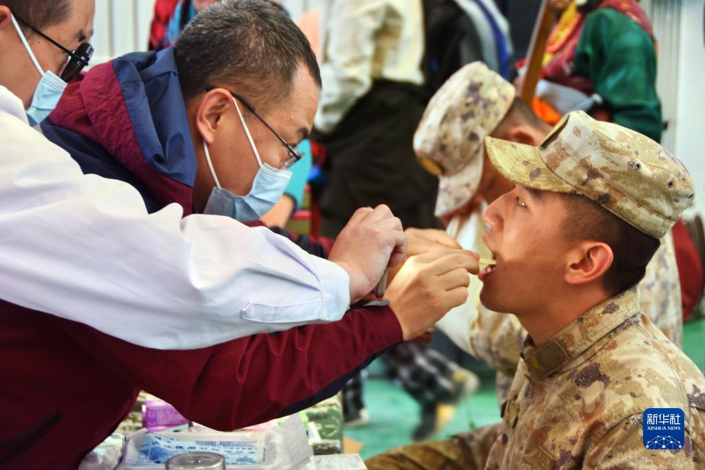 在西藏阿里地區,西安交通大學口腔醫院援藏醫生為解放軍戰士檢查牙齒(7月27日攝)。