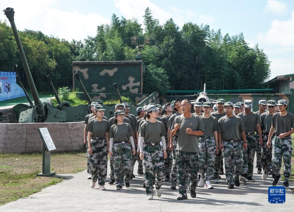 7月27日,張勇(前右)在國防園重武器展示園給參加軍訓的青年人講述歷史。