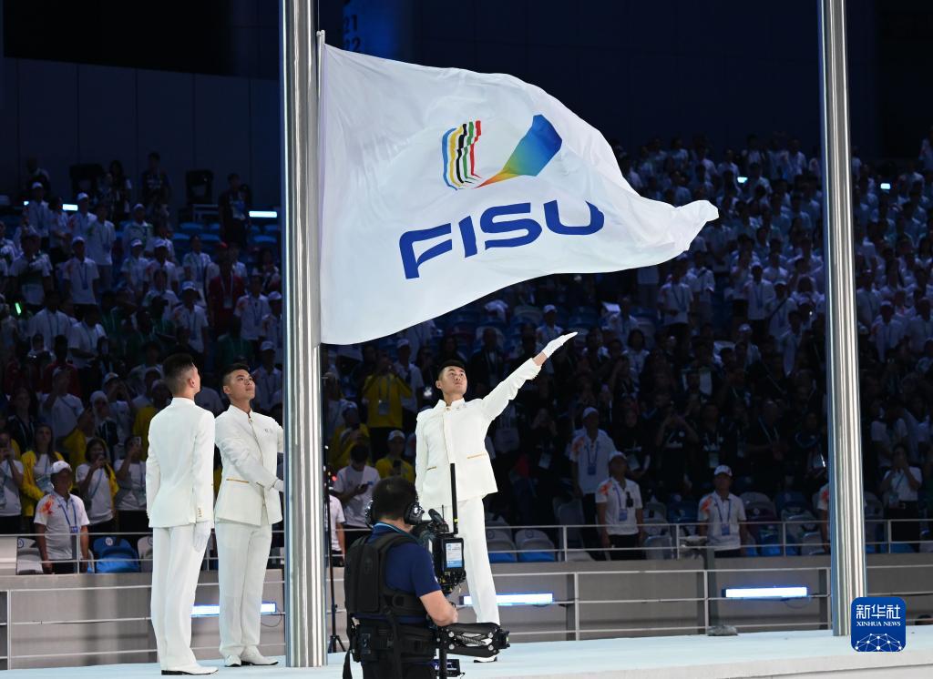 7月28日,國際大學生體育聯合會會旗在開幕式上升起。