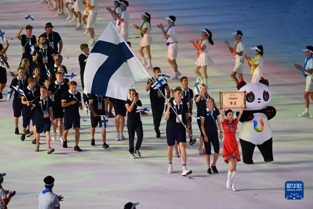 7月28日,芬蘭大學生體育代表團在開幕式上入場。