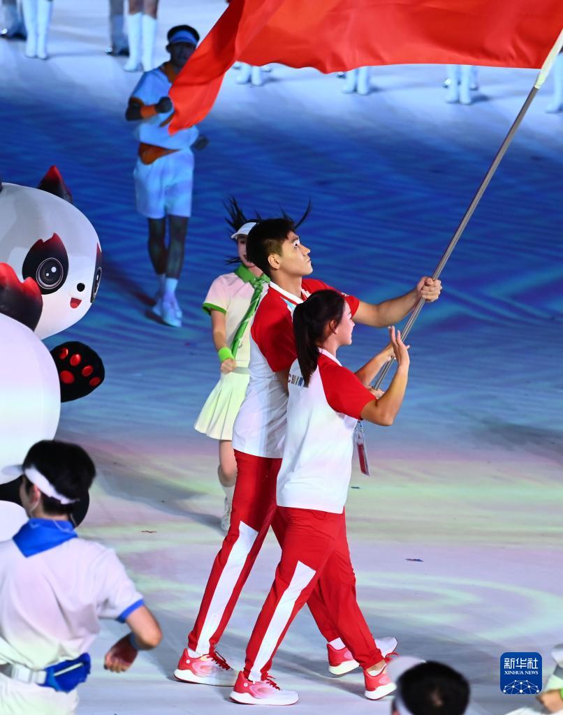 7月28日,中國大學生體育代表團旗手胡朕卓(左)與郭涵煜在開幕式上入場。