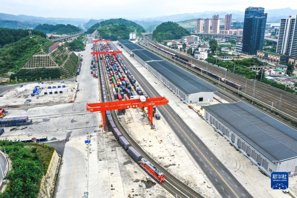 7月28日,貴陽國際陸港首次開行的直達中亞班列從貴陽都拉營站駛出(無人機照片)。