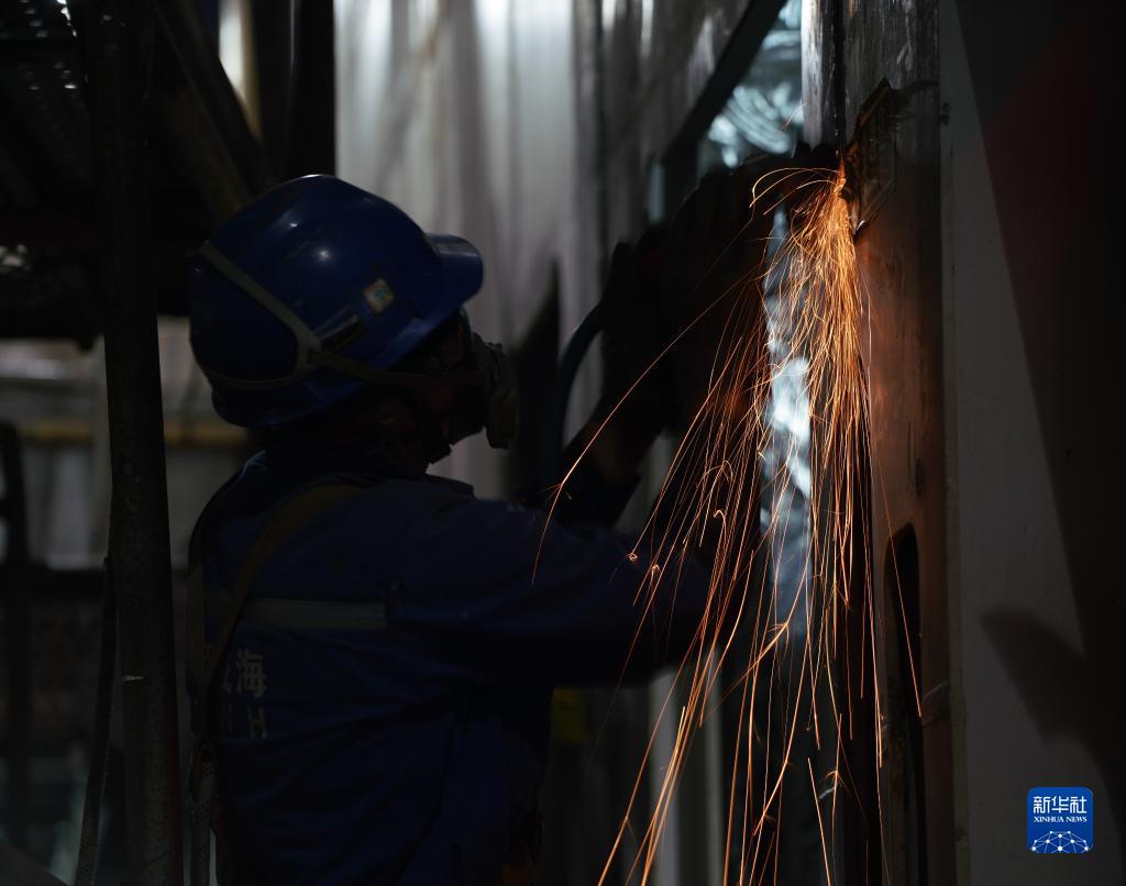 7月28日,招商局金陵船舶(威海)有限公司的工人在船體內部作業。