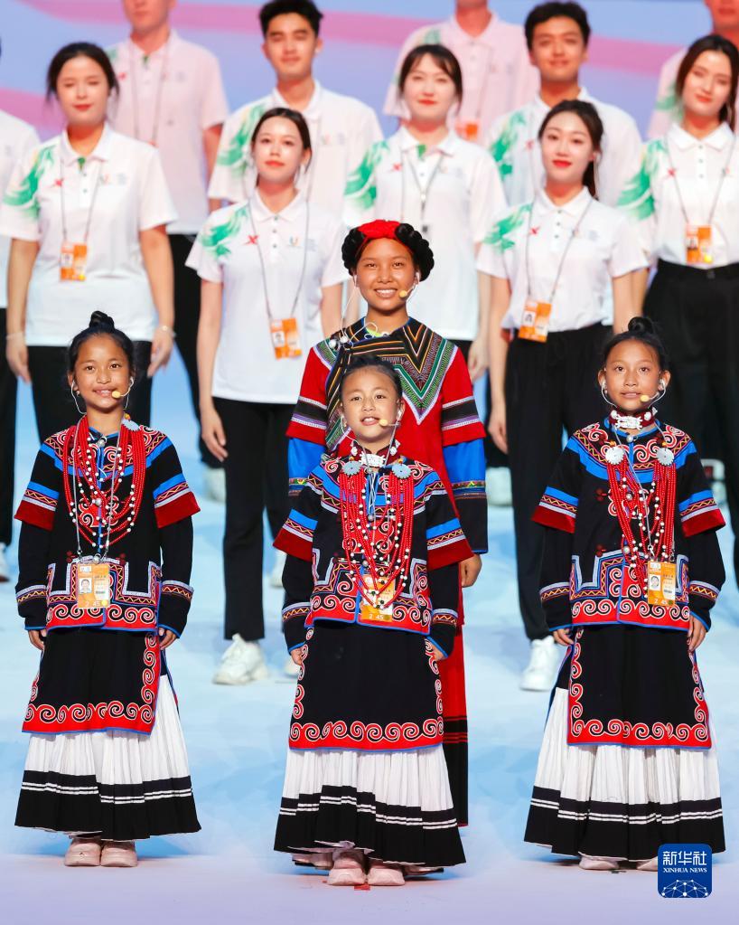 7月8日,俄地惹漢、馬杰英、吉合拉作(前排從左至右)和吉好有果(中)參加成都大運會開幕式彩排。新華社記者 沈伯韓 攝