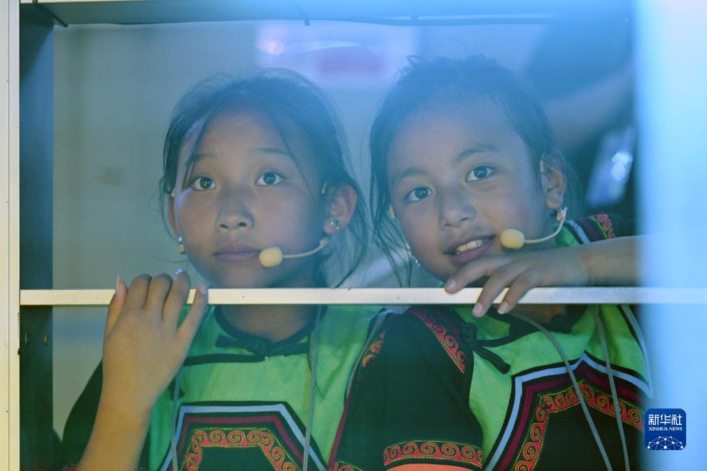 7月16日,吉合拉作(左)與馬杰英在成都大運會開幕式彩排現場觀看演出。新華社記者 胥冰潔 攝