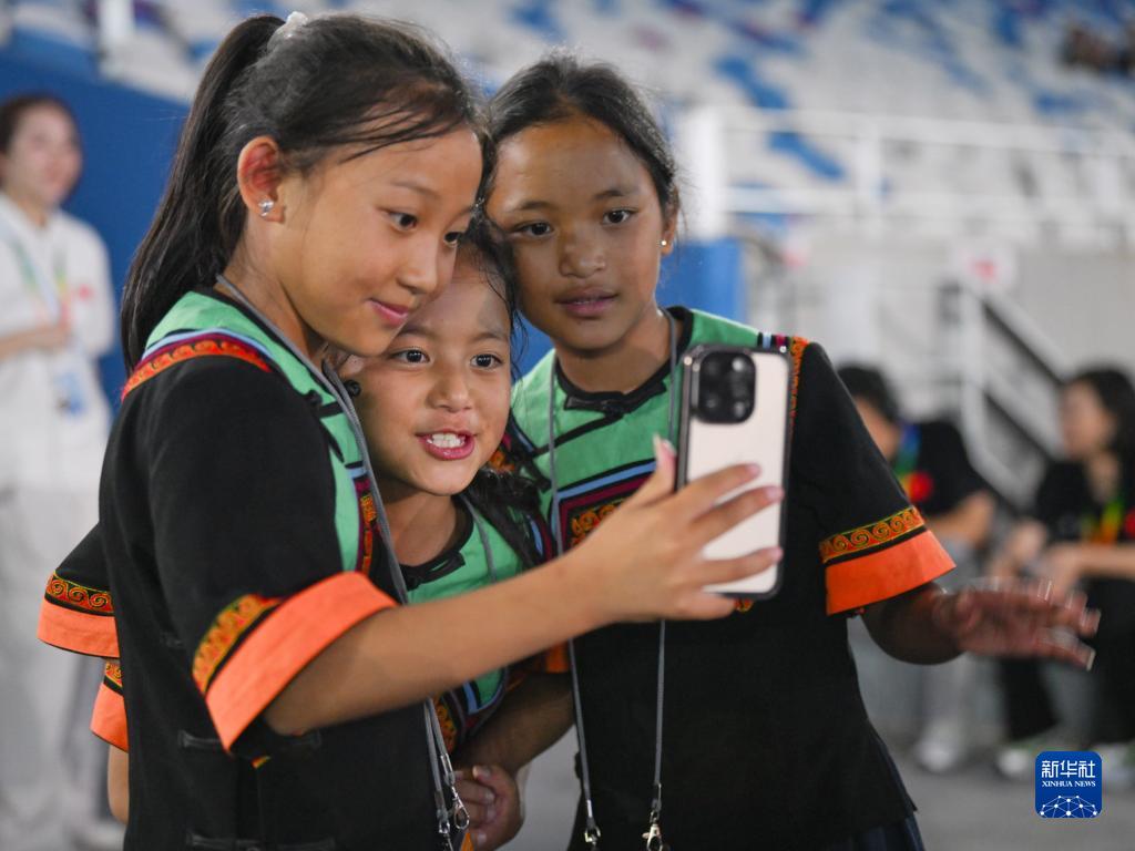 7月16日,吉合拉作(左)、馬杰英(中)和俄地惹漢(右)在排練結束后和朋友視頻。新華社記者 胥冰潔 攝