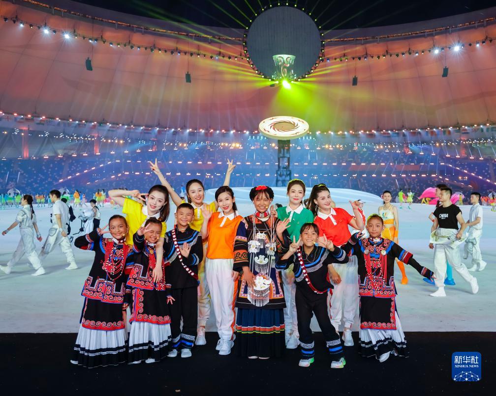 7月23日,成都大運會開幕式彩排結束后,演員和來自大涼山的孩子們合影。新華社記者 沈伯韓 攝