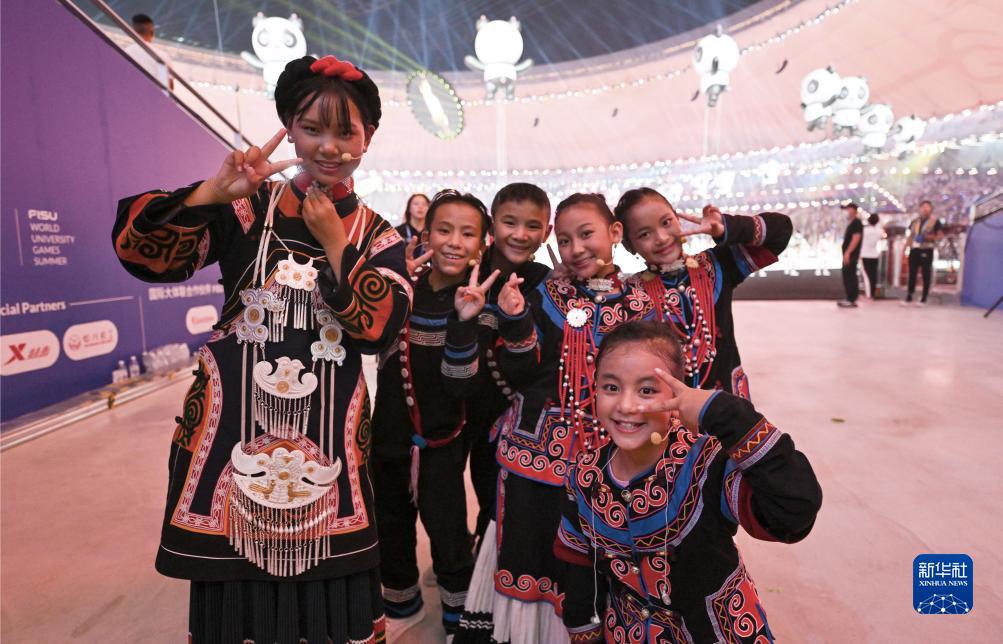 7月28日,來自四川涼山彝族自治州的孩子們在成都大運會開幕式結束后合影留念。新華社記者 胥冰潔 攝