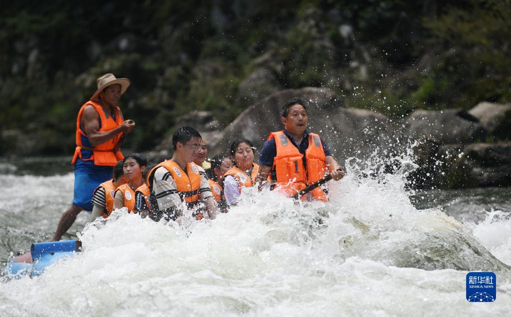7月28日,游客在湖南省資興市東江湖景區體驗東江漂流。