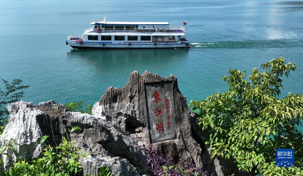 7月26日,游客在湖南省資興市東江湖乘船游覽(無人機照片)。