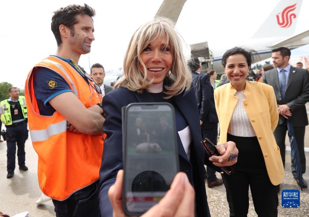 7月25日,在法國巴黎戴高樂機場,法國總統夫人布麗吉特·馬克龍用手機展示她與大熊貓“圓夢”的合影。