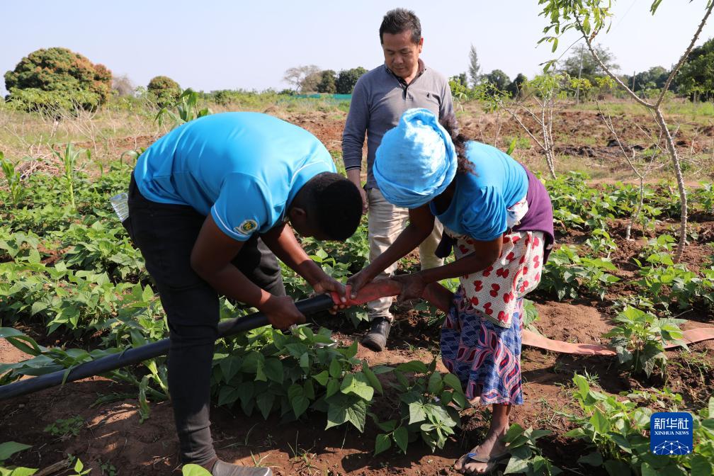 7月28日,在莫桑比克馬普托省博阿內地區,中莫農業技術示范中心技術員(左)幫助當地農民接水管。