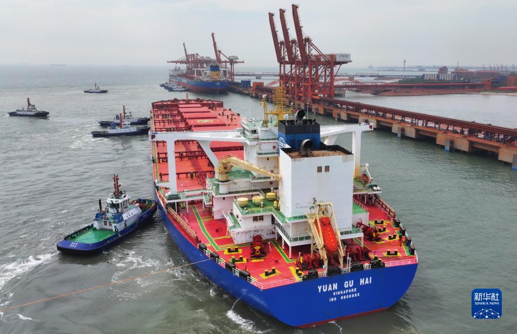 7月28日,滿載約40萬噸巴西鐵礦石的“遠谷?!陛喸谕陷喌膮f助下向河北港口集團唐山港曹妃甸港區礦石碼頭靠泊(無人機照片)。