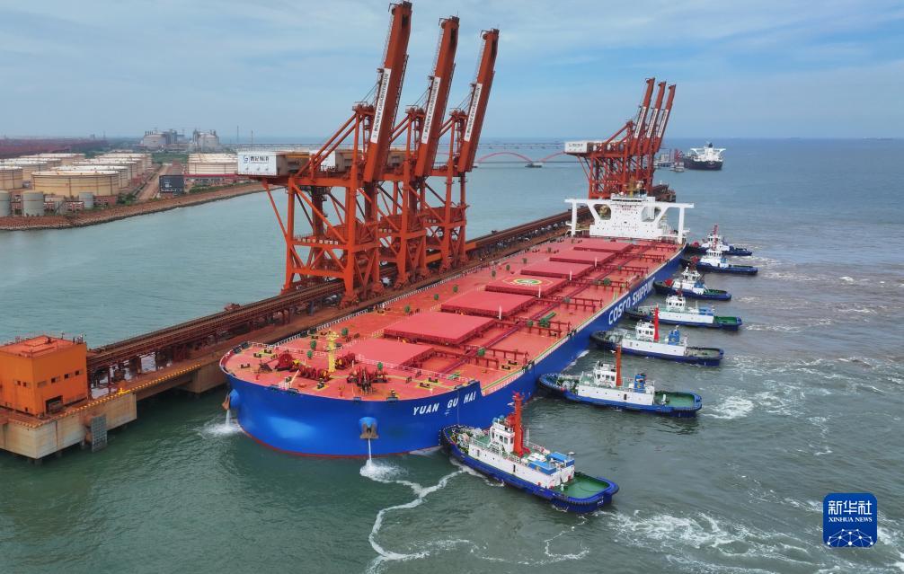 7月28日,滿載約40萬噸巴西鐵礦石的“遠谷?!陛喸谕陷喌膮f助下向河北港口集團唐山港曹妃甸港區礦石碼頭靠泊(無人機照片)。