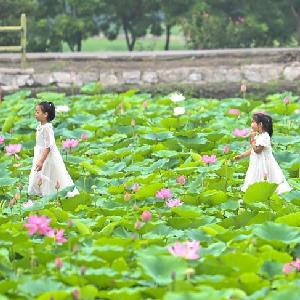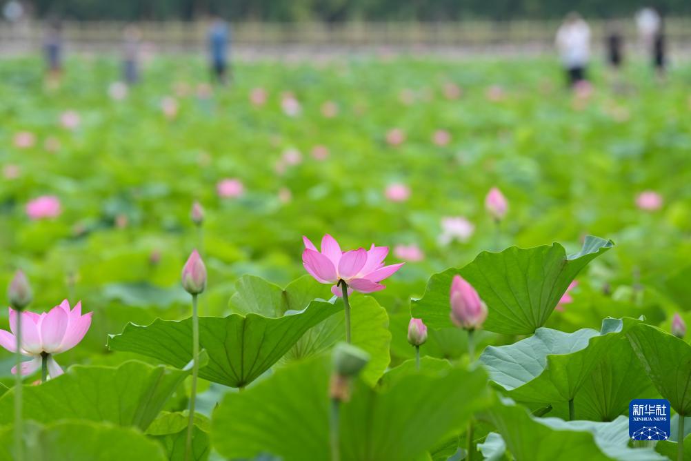 夏日,山西省太原市晉源區北大寺村的荷花競相開放,吸引眾多游客前來觀賞。