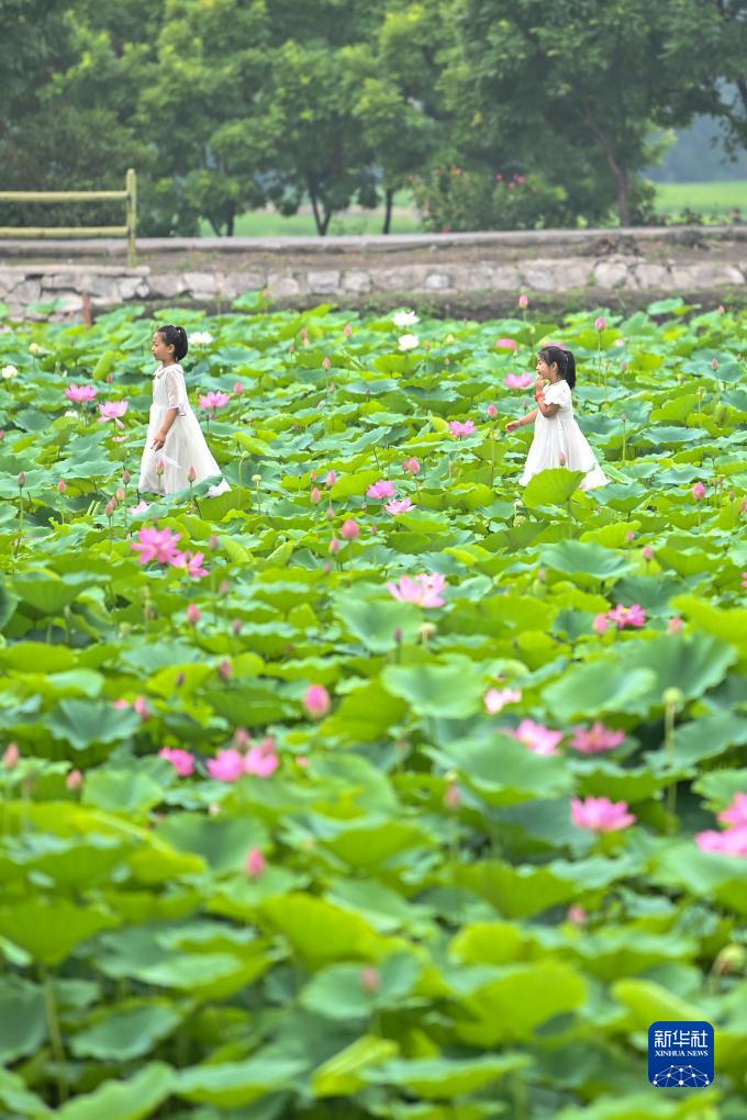 夏日,山西省太原市晉源區北大寺村的荷花競相開放,吸引眾多游客前來觀賞。