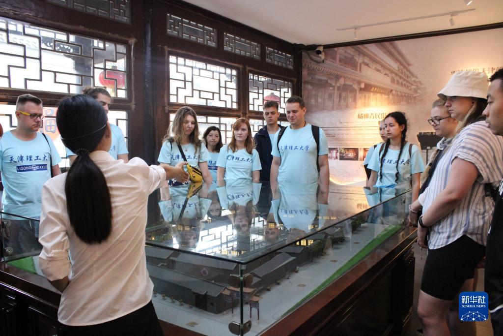 參加夏令營的來華學生在天津市西青區楊柳青鎮石家大院參觀(7月21日攝)。