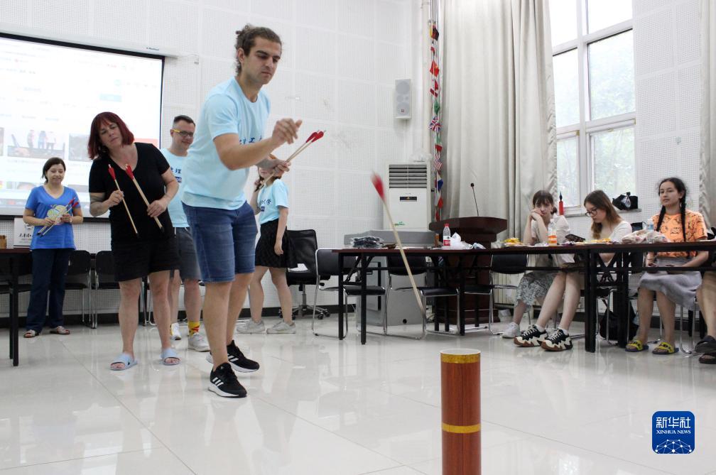 參加夏令營的來華學生在天津理工大學體驗投壺游戲(7月21日攝)。