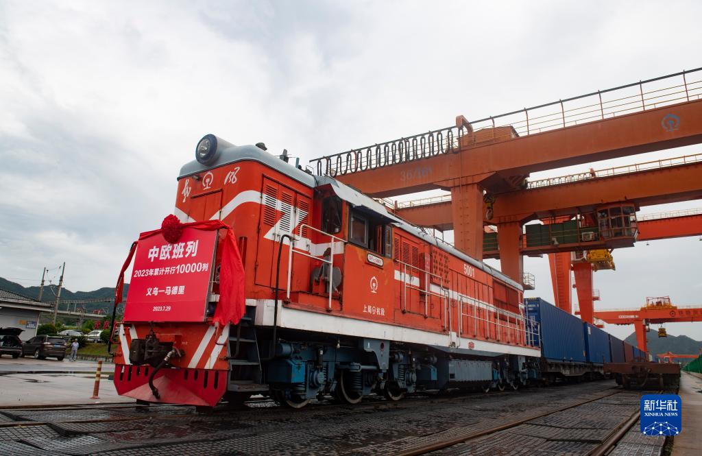 7月29日10時18分,隨著X8020次中歐班列從義烏西站緩緩開出,前往西班牙馬德里,今年中歐班列累計開行已達10000列,較去年提前22天破萬列,發送貨物108.3萬標準箱,同比增長27%。