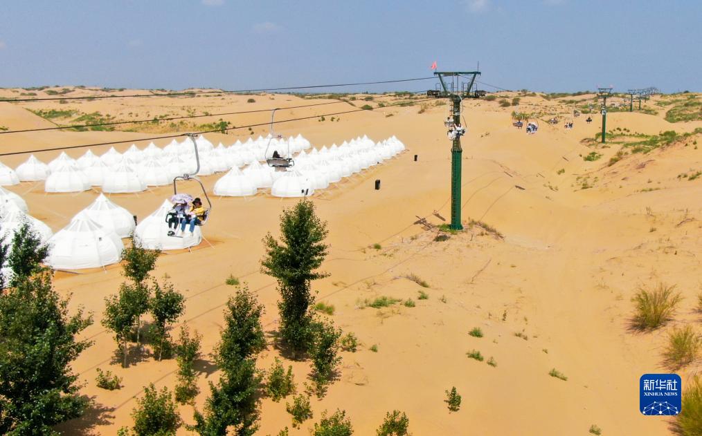 游客在鄂爾多斯市達拉特旗境內庫布其沙漠中的銀肯塔拉景區中體驗觀光纜車(7月29日攝,無人機照片)。