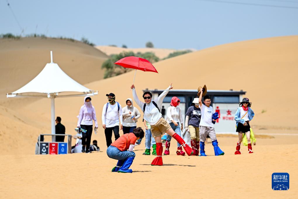 盛夏時節,內蒙古鄂爾多斯市達拉特旗境內的庫布其沙漠游客絡繹不絕,沙漠旅游一派火熱。游客們在飽覽大漠美景的同時,也體驗騎駱駝、滑沙等項目的獨特魅力。