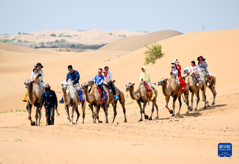 盛夏時節,內蒙古鄂爾多斯市達拉特旗境內的庫布其沙漠游客絡繹不絕,沙漠旅游一派火熱。游客們在飽覽大漠美景的同時,也體驗騎駱駝、滑沙等項目的獨特魅力。