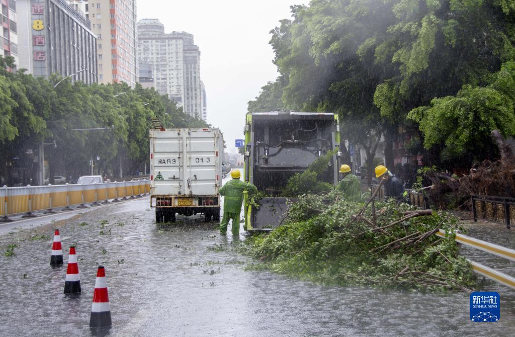 7月29日,工作人員在福州市晉安區福新路上清理被臺風刮倒的樹木。