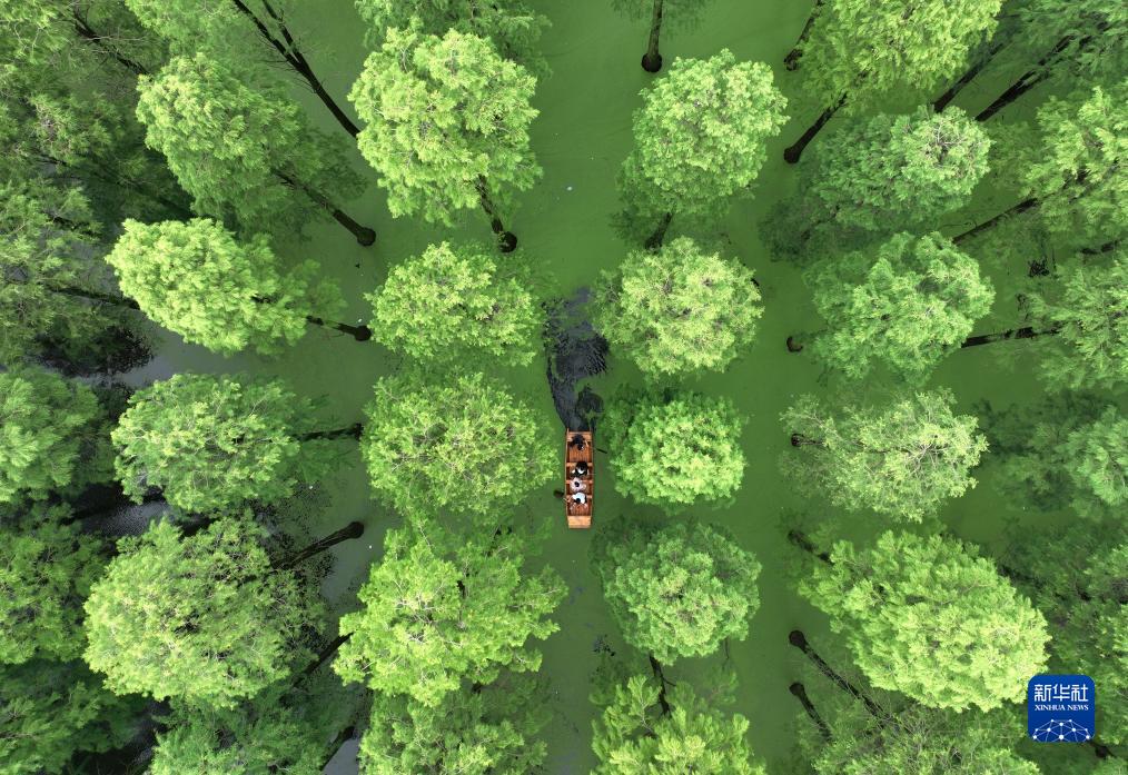 7月21日,游客在江蘇省揚州市江都區淥洋湖濕地公園的水上森林乘船游覽(無人機照片)。