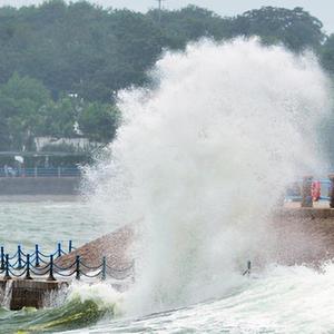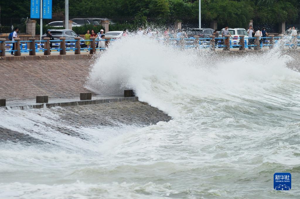 7月29日,在山東省青島市澳門路,海浪拍向岸邊。