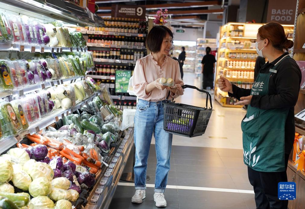 7月28日,朱春南在超市里給雇主家買菜時,和售貨人員交流。