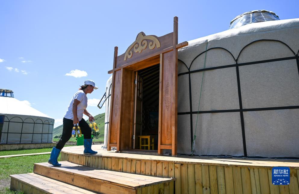7月24日,白薩仁為蒙古包中的客人提供啤酒。