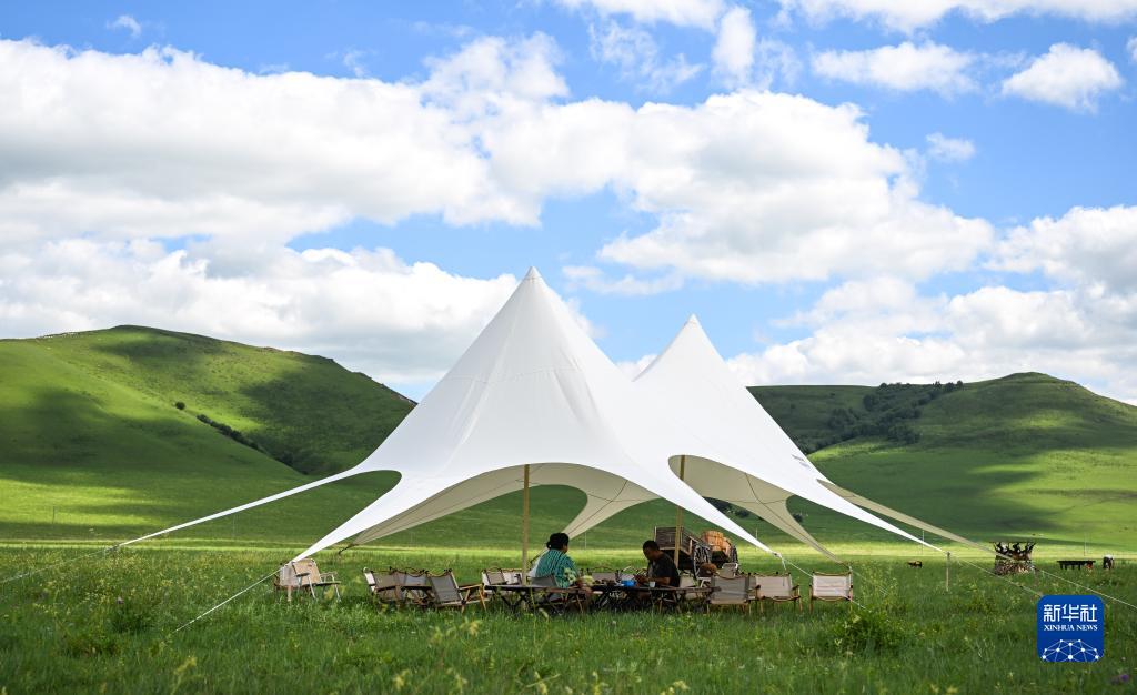 游客在蘇道家庭牧場的天幕下用餐(7月24日攝)。